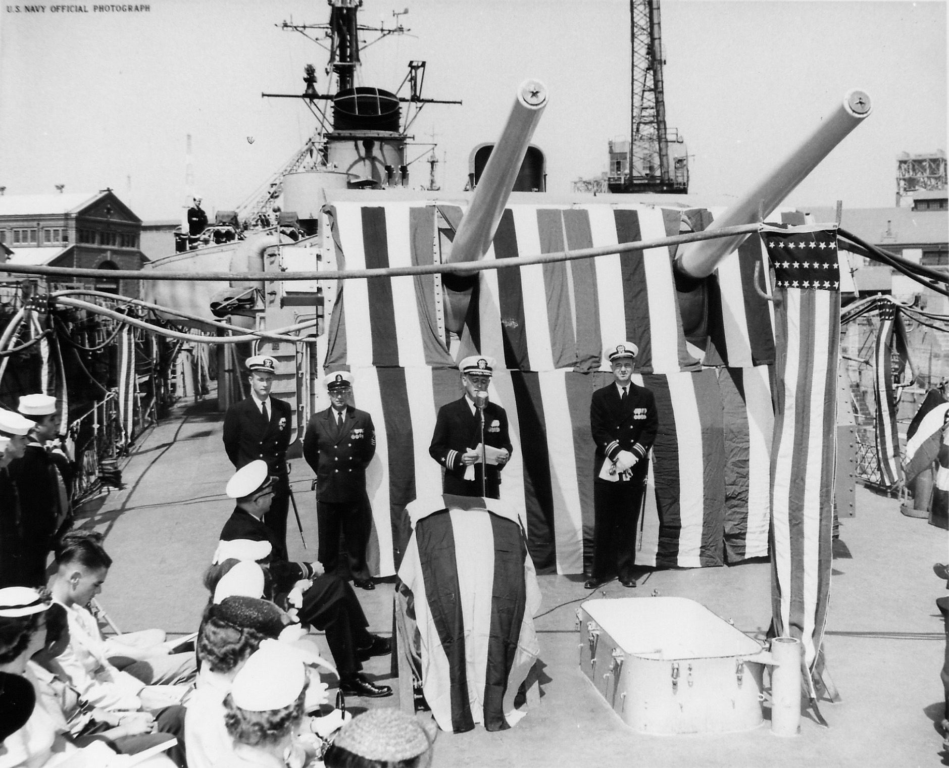 406k | LCDR George Birdt relieves CDR Theodore L. Balis as Commanding Officer of Orleck, 22 August 1957. Mare Island Navy Yard photo DD 886 36284-8-57, from files of Vallejo Naval & Historical Museum. | Darryl Baker |