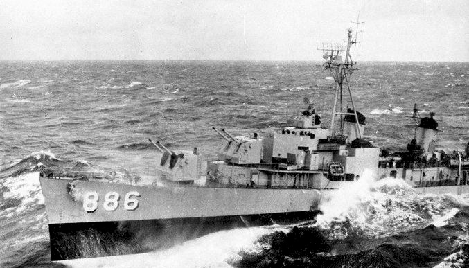 | 91k | USS Orleck (DD-886) in heavy seas, in the 1950s. U.S. Navy photo from the USS Myles C. Fox DD-829 veteran's website. | Robert Hurst |
