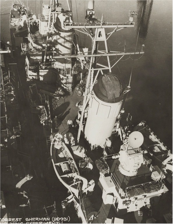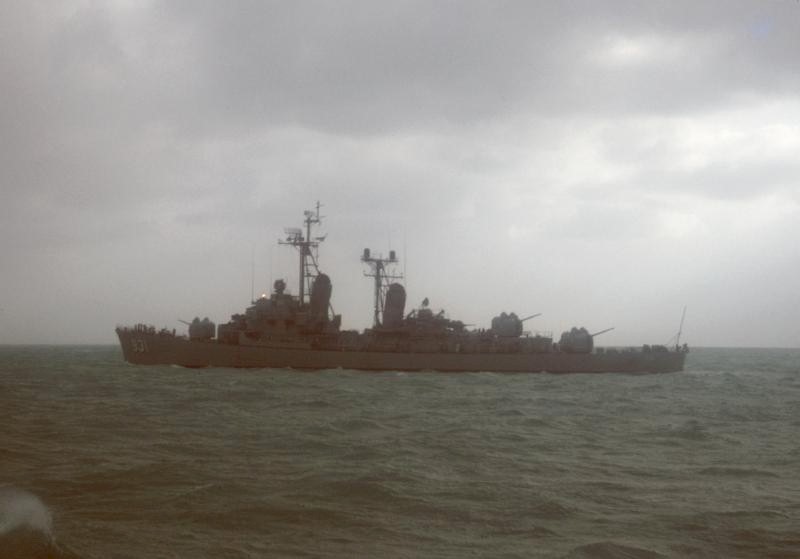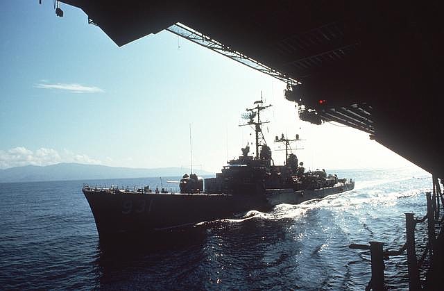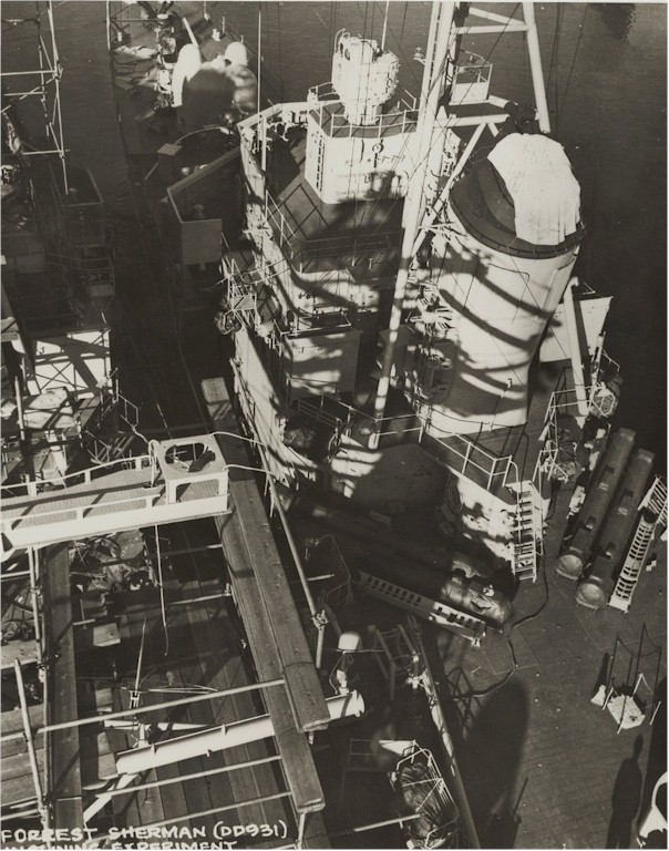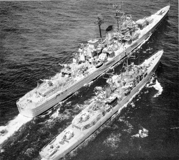 | 55k | June 1, 1974 the destroyer USS Forrest Sherman (DD-931) alongside an aircraft carrier during an underway replenishment. | Fred Weiss |