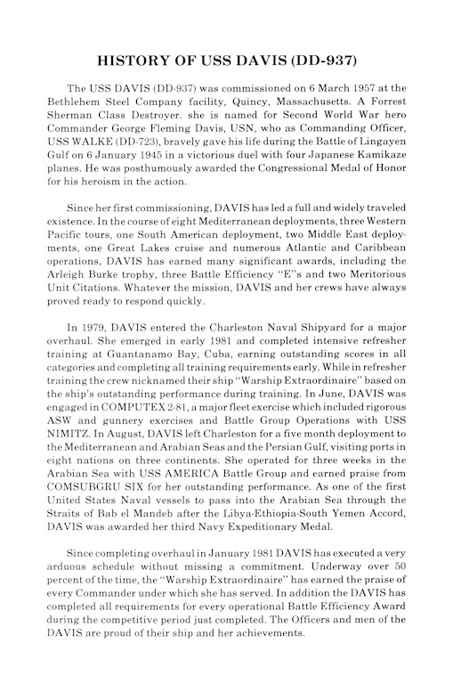 "For conspicuous gallantry and intrepidity at the risk of his life above and beyond the call of duty as Commanding Officer of the U.S.S. Walke engaged in a detached mission in support of minesweeping operations to clear the waters for entry of our heavy surface and amphibious forces preparatory to the invasion of Lingayen Gulf, Luzon, Philippine Islands, 6 January 1945. Operating without gun support of other surface ships when four Japanese suicide planes were detected flying low overland to attack simultaneously, Commander Davis boldly took his position in the exposed wings of the bridge and directed control to pick up the leading plane and open fire. Alert and fearless as the Walke's deadly fire sent the first target crashing into the water and caught the second as it passed close over the bridge to plunge into the sea off portside, he remained steadfast in the path of the third plane plunging swiftly to crash the after end of the bridge structure. Seriously wounded when the plane struck, drenched with gasoline and immediately enveloped in flames, he conned the Walke in the midst of the wreckage; he rallied his command to heroic efforts; he exhorted his officers and men to save the ship and, still on his feet, saw the barrage from his guns destroy the fourth suicide bomber. With the fires under control and the safety of the ship assured, he consented to be carried below. Succumbing several hours later, Commander Davis, by his example of valor and his unhesitating self-sacrifice, steeled the fighting spirit of his command into unyielding purpose in completing a vital mission. He gallantly gave his life in the service of his country."