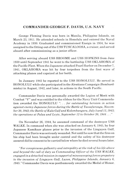 George Fleming Davis was born in Manila, Philippines, 23 March 1911. He was appointed to the United States Naval Academy from the Naval Reserve in 1930 and graduated in May 1934. Ensign Davis' first duty station was the new heavy cruiser Tuscaloosa (CA-37). While in that ship he served as an aircraft gunnery observer with her embarked aviation units. From 1939 to 1941 Lieutenant (Junior Grade) Davis served as an officer aboard destroyer Broome (DD-210) and fast minesweeper Hopkins (DMS-13). Following promotion to the rank of Lieutenant in mid-1941 he was assigned to the battleship Oklahoma (BB-37), which was sunk on 07 December 1941 when Japan's surprise attack on Pearl Harbor opened the Pacific War. In January 1942 Lieutenant Davis was transferred to the light cruiser Honolulu (CL-48), in which he participated in operations in the Aleutian Islands, the hard fighting over Guadalcanal and the Central Solomons, and the campaign to recover Guam. While serving as Honolulu's First Lieutenant and Damage Control Officer, Davis received the Legion of Merit with Combat "V" for "exceptionally meritorious conduct." He was promoted to Lieutenant Commander and Commander while serving in Honolulu, which he left in mid-1944. Following training in advanced surface warfare techniques, he was given command of the destroyer Walke (DD-723) in late November 1944. On 07 December 1944, Walke rescued all the survivors of stricken destroyer Mahan (DD-364) in Ormoc Bay amidst the Mahan's exploding magazines and persistent enemy air attack. For this action, Davis received the Silver Star. On 06 January 1945 his ship was covering minesweeping operations in advance of the Lingayen Gulf invasion when she was attacked by four Japanese Kamikazes. Though Walke shot down two, the third plane struck the ship, enveloping her bridge area in burning gasoline. Though horribly burned, Commander Davis remained on his feet, conned the ship, directed damage control efforts and saw to the destruction of the fourth suicide plane. Only when Walke's survival was assured did he relinquish his post to be taken below, where he died a short time later. For his conduct, Commander George F. Davis was posthumously awarded the Medal of Honor. His body was buried at sea.