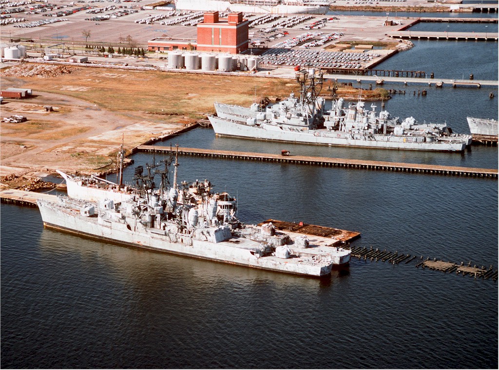 314k | An aerial view of the Baltimore Fairfield Terminal area showing various former U.S. Navy destroyers awaiting the scrapper's torch. From bottom to top: the destroyers Blandy (DD-943) and Forrest Sherman (DD-931), the former U.S. Army N-3 type port repair ship Madison Jordon Manchester (ex USS Hydra (AK-82)), the guided missile destroyers USS Claude V. Ricketts (DDG-5) and USS Lawrence (DDG-4), the destroyer USS Davis (DD-937) and the bow of the USS Bigelow (DD-942), November 11 1994. Photo courtesy of the National Archives. | Bill Gonyo |
