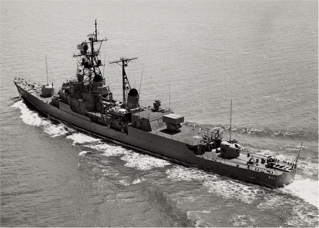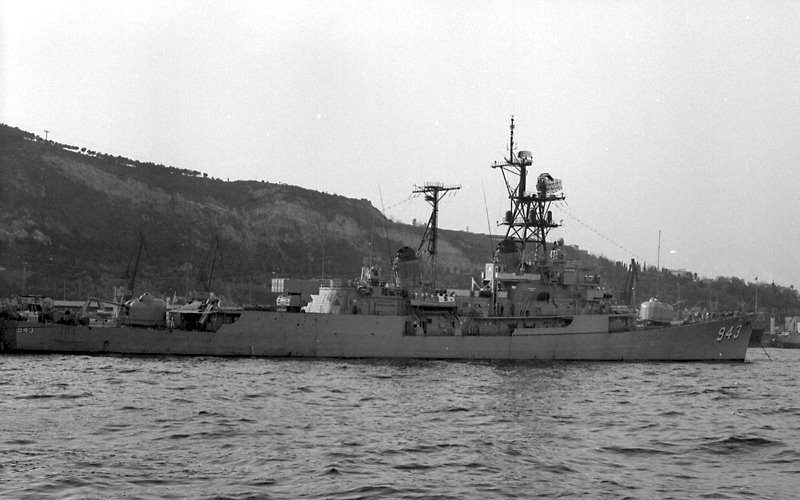 | 96k | Taken in Barcelona, Spain, on March 6, 1978. This view shows the ship after her ASW modernization, with 3"/50 guns removed; an ASROC "pepperbox" substituted for No. 2 5"/54 mount; triple Mk.32 torpedo tubes on the 01 level, just forward of the bridge; SQS-35 VDS on the fantail (along with a keel-mounted SQS-23, obviously invisible here). She was also fitted with an SPS-40 air search radar and two gun directors: a Mk.68 forward and a Mk.56 aft. | Fabio Peña |