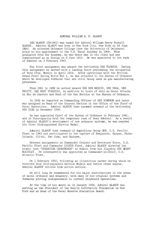 | 52k | William Henry Purnell Blandy was born on 28 June 1890 in New York City. He was appointed a Midshipman to the US Naval Academy in the entering class of 1909. He subsequently, graduated number 1 in his Class of 1913 and was appointed an Ensign in the United States Navy. Blandy's initial assigned was to the battleship USS Florida BB-30, where he served from 1913 to 1918. This included the landing at Vera Cruz, Mexico in 1914 and service with the British Grand Fleet during the First World War. He left the Florida as a temporary lieutenant commander in November of 1918. He served short tours at the US Naval Headquarters in London, England and with the Bureau of Ordnance, until 1919. He received advanced training in ordnance at the Naval Academy and the Naval Gun Factory, where he made many significant contributions.
