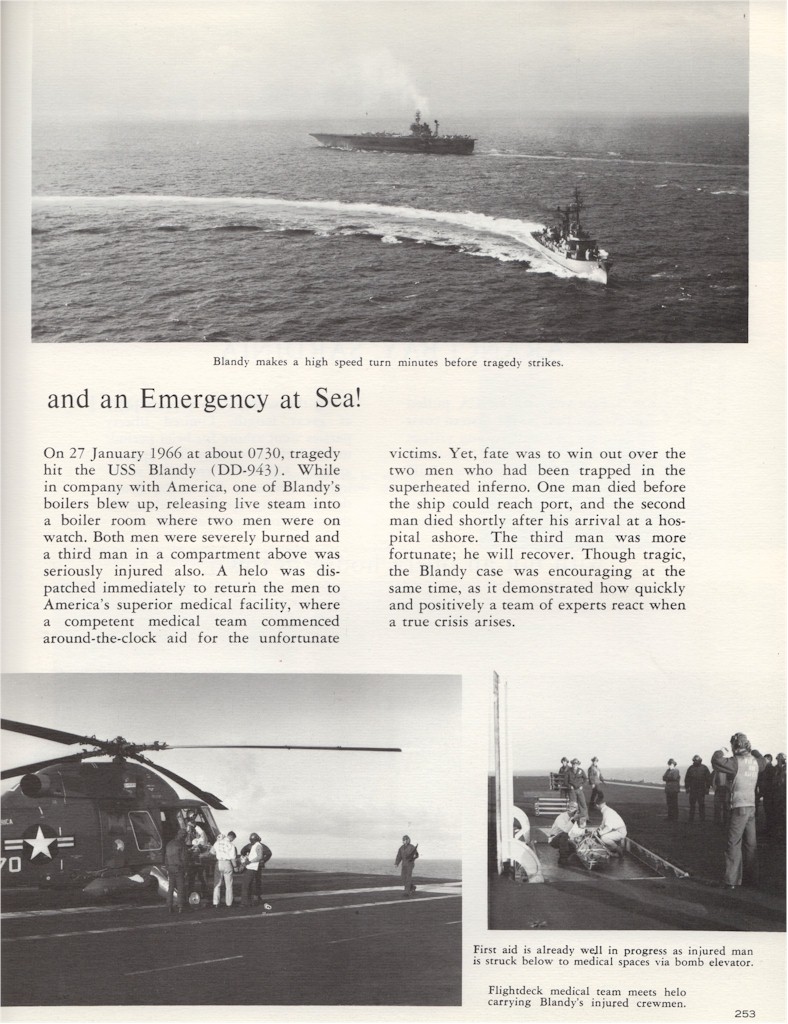 | 206k | Page from the USS America (CVA-66) cruisebook showing the events of the January 27 1966 boiler explosion aboard the Blandy. | Thomas Becher |