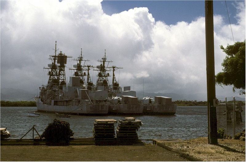 | 101k | DN-ST-86-09571. June 24 1986, a view of several mothballed ships at anchor near Beckoning Point, in the East Loch of Pearl Harbor, Hawaii. They are, left to right, the guided-missile destroyer Somers (DDG 34), and the destroyers Morton (DD 948) and Richard S. Edwards (DD 950). U.S. Navy Photo by Don S. Montgomery. | Robert M. Cieri |