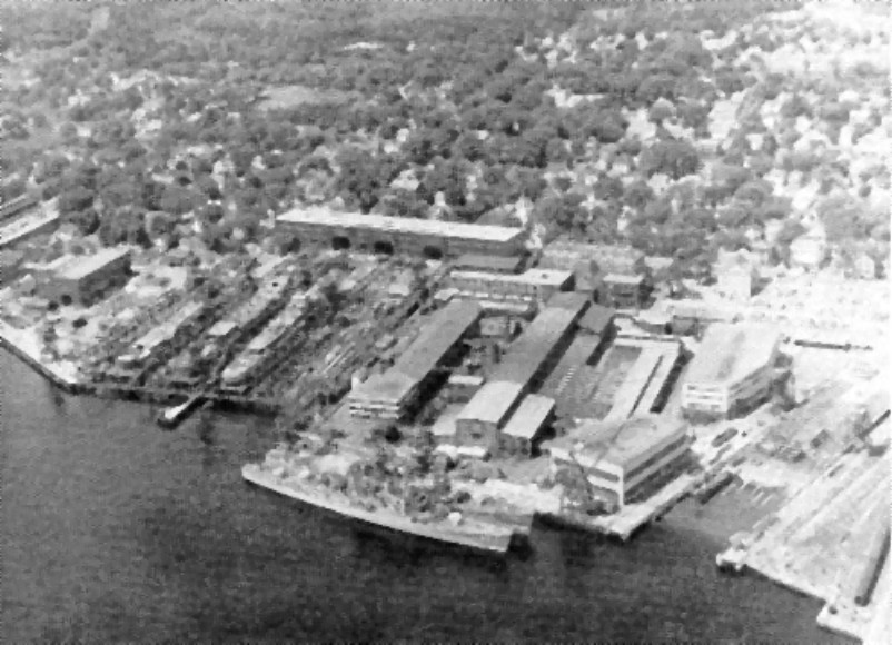 | 117k | USS Du Pont (DD-941) outboard & USS Bigelow (DD-942) at the fitting out pier of Bath Iron Works in 1957. On the building ways are (from right to left) Hull (DD-945), Edson (DD-946) and Somers (DD-947). | Robert Hurst |