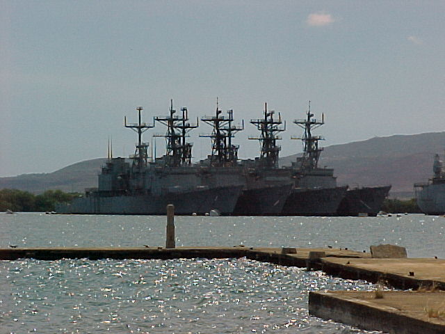 | 73k | June 4 2000, Middle Loch, Pearl Harbor, Oahu Hawaii, starboard bow view of four decommissioned Spruance class destroyers. They are: USS Ingersoll (DD 990 ), USS Harry W. Hill (DD 986), USS Leftwich (DD 984) and USS Merrill (DD 976). The ships are moored at the Naval Ships Intermediated Maintenance Facility. | Fred Weiss |