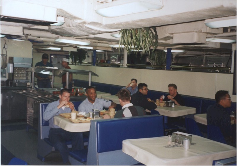 Tiger Cruise in 1998. Scott is the guy with the burger in his mouth on the left. Sitting to my left is RM2 Michael Bee. Sitting on the opposite side of the table is Scott's brother. | Scott Akins |