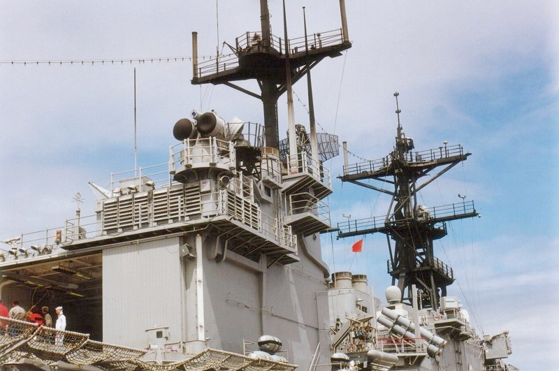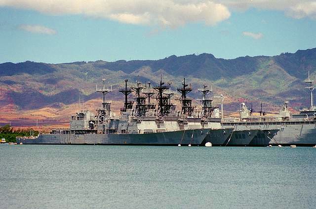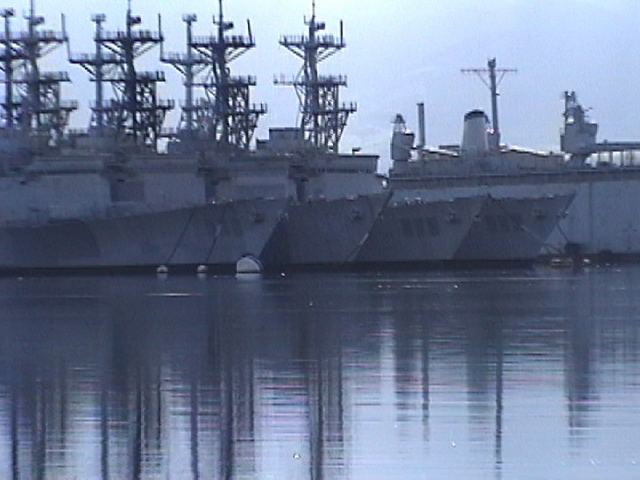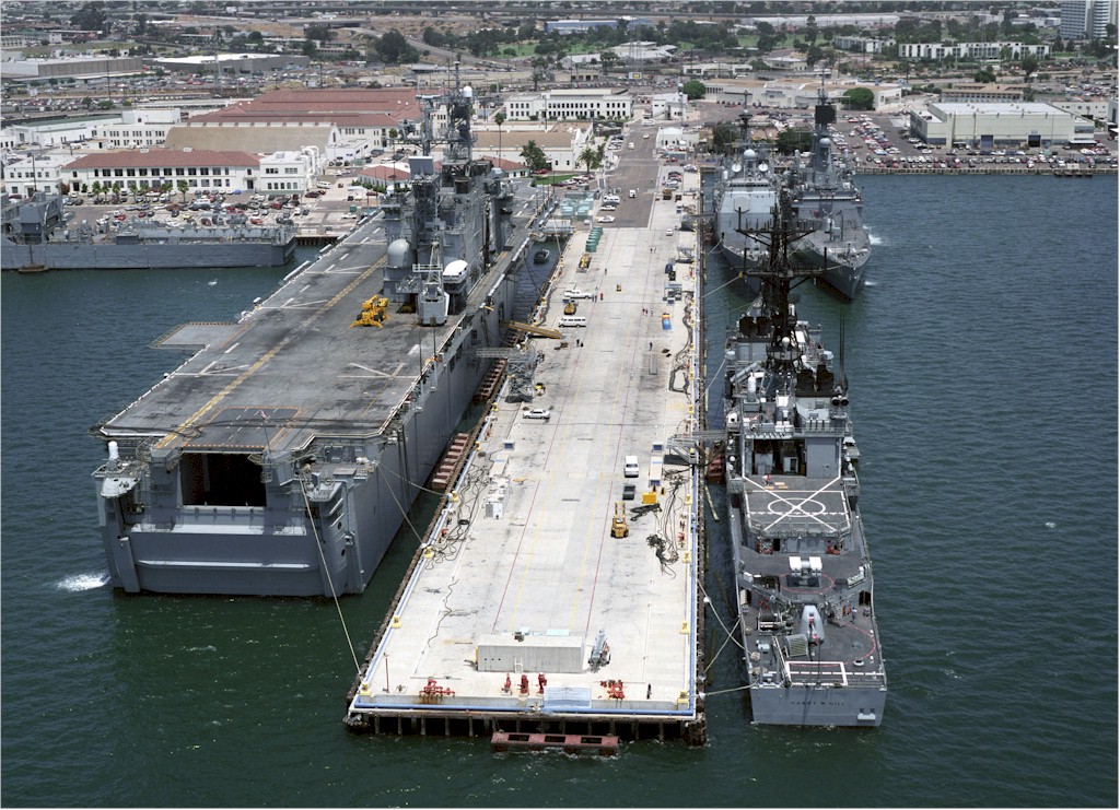 | 269k | DN-SC-04-15494. Naval Station San Diego, June 1 1992, aAerial view of the 32nd Street Naval Station Pier 2, showing various ships berthed there. The Tarawa-class amphibious assault ship USS Belleau Wood (LHA 3) (left), the Spruance-class destroyer USS Harry W. Hill (DD 986) (across the pier) an unidentified Ticonderoga-class guided-missile cruiser (rear left) and the Virginia-class nuclear-powered guided-missile cruiser USS Arkansas (CGN 41) outboard of her. U.S. Navy photo by PH2 M. Correa. | Robert M. Cieri |