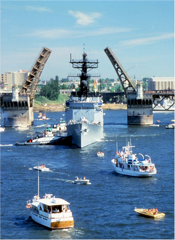 | 129k | DN-ST-83-02909. Bow view of the destroyer USS Harry W. Hill (DD 986) passing through the Burnside Bridge on the Willamette River, to participate in the 74th annual Portland rose festival on 1 December 1982. Taken by: Michael Lloyd. | Robert M. Cieri |