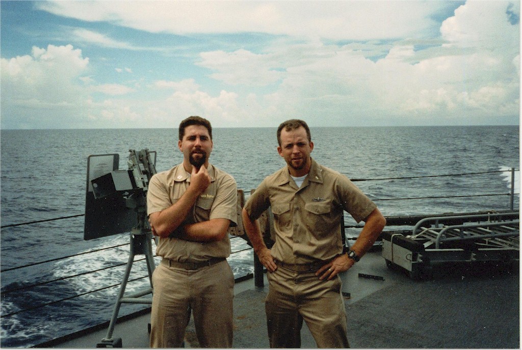 | 207k | Ship's Navigator LT John Duerden with EMO ENS Dan Pearson after purchasing "Beard Chits" during HILL's last deployment, 1998. | Dan Pearson |