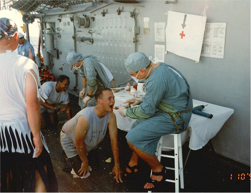 | 213k | Voluntary participants line up to see the Royal Dentist and Royal Doctor during the Crossing the Line ceremony in 1998. | Dan Pearson |