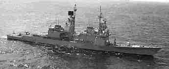 | 115k | The CALLAGHAN underway in the Sea of Okhotsk has an ominous appearance. This missile-armed version of the SPRUANCE represents the DXG variant of the class, a type planned but not ordered for the U.S. Navy. These ships are quickly distinguished from the SPRUANCEs by the Mk 26 missile launchers forward and aft and the SPS-48 three-dimensional radar antenna. (1983, U.S. Navy) | Joe Radigan | |