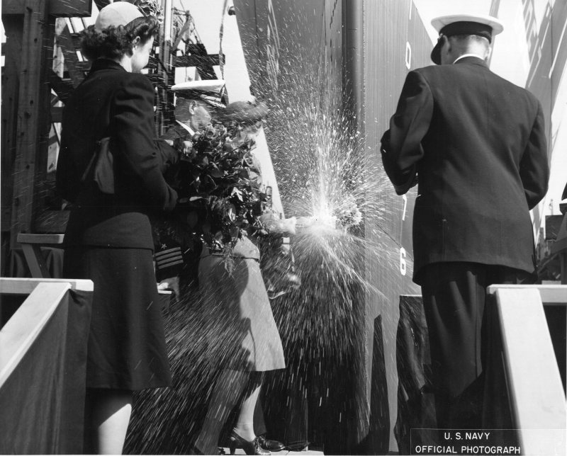 bottle of champagne against bow while Mrs. Stanislaus Z. Natcher, Matron of Honor, far left, Capt W. E. Malloy, Planning Officer, second from the left and Capt A. D. Denny, Captain of the Yard,