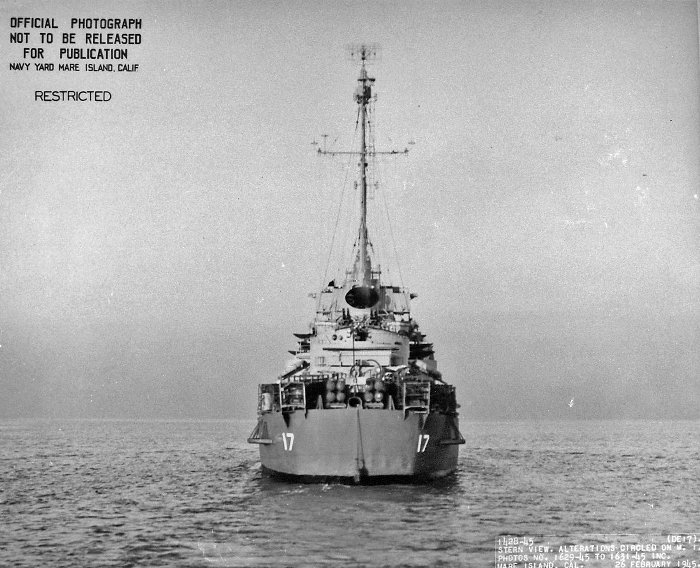 94k | 26 February 1945: Stern view, note new quad 40mm gun mount aft. (U.S. Navy Photo #DE-17-1428-45) | ||