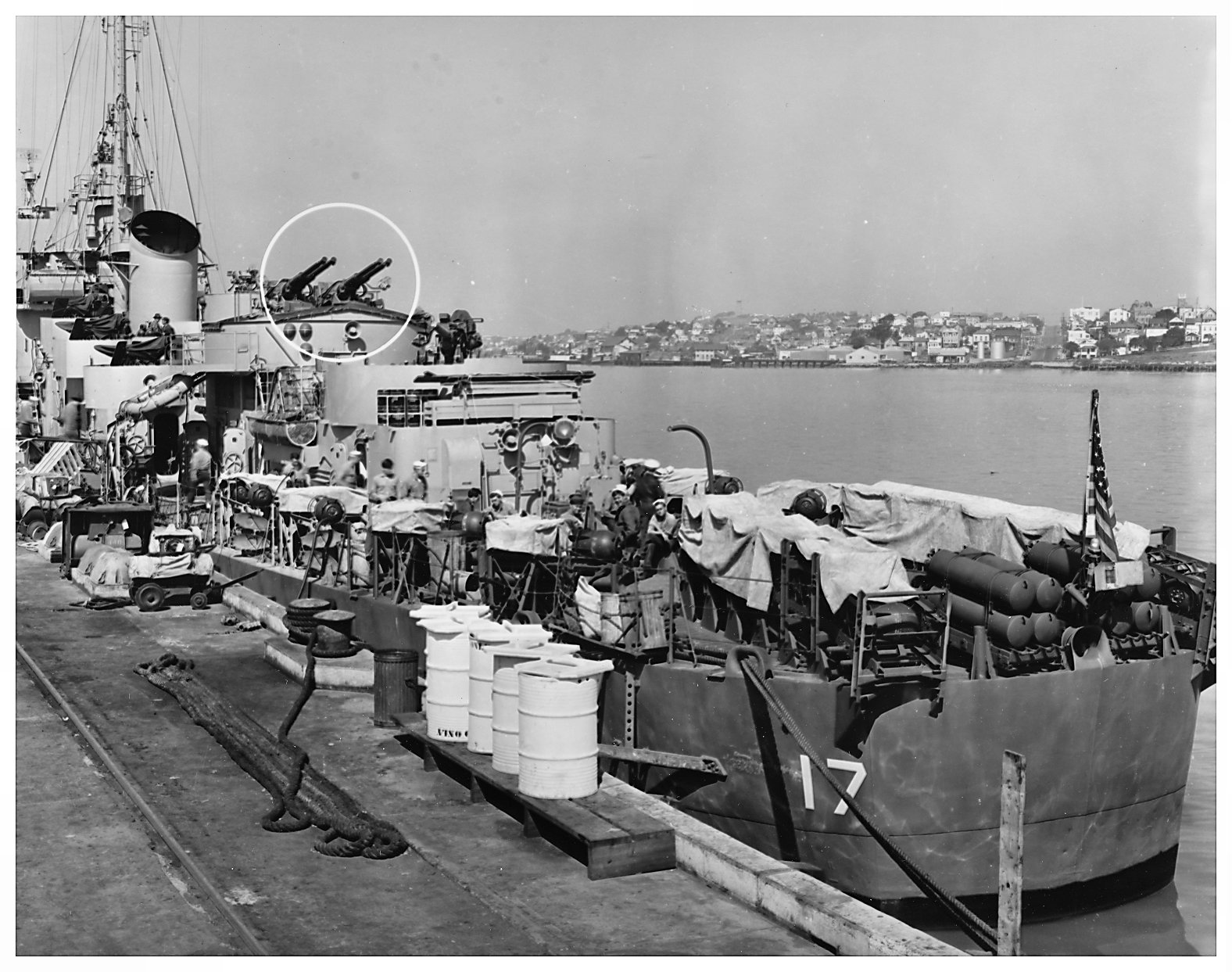 Circle marks newly installed 40mm quad gun mount. (U.S. Navy National Archives photo #19-N-79887 from the Naval History and Heritage Command) |