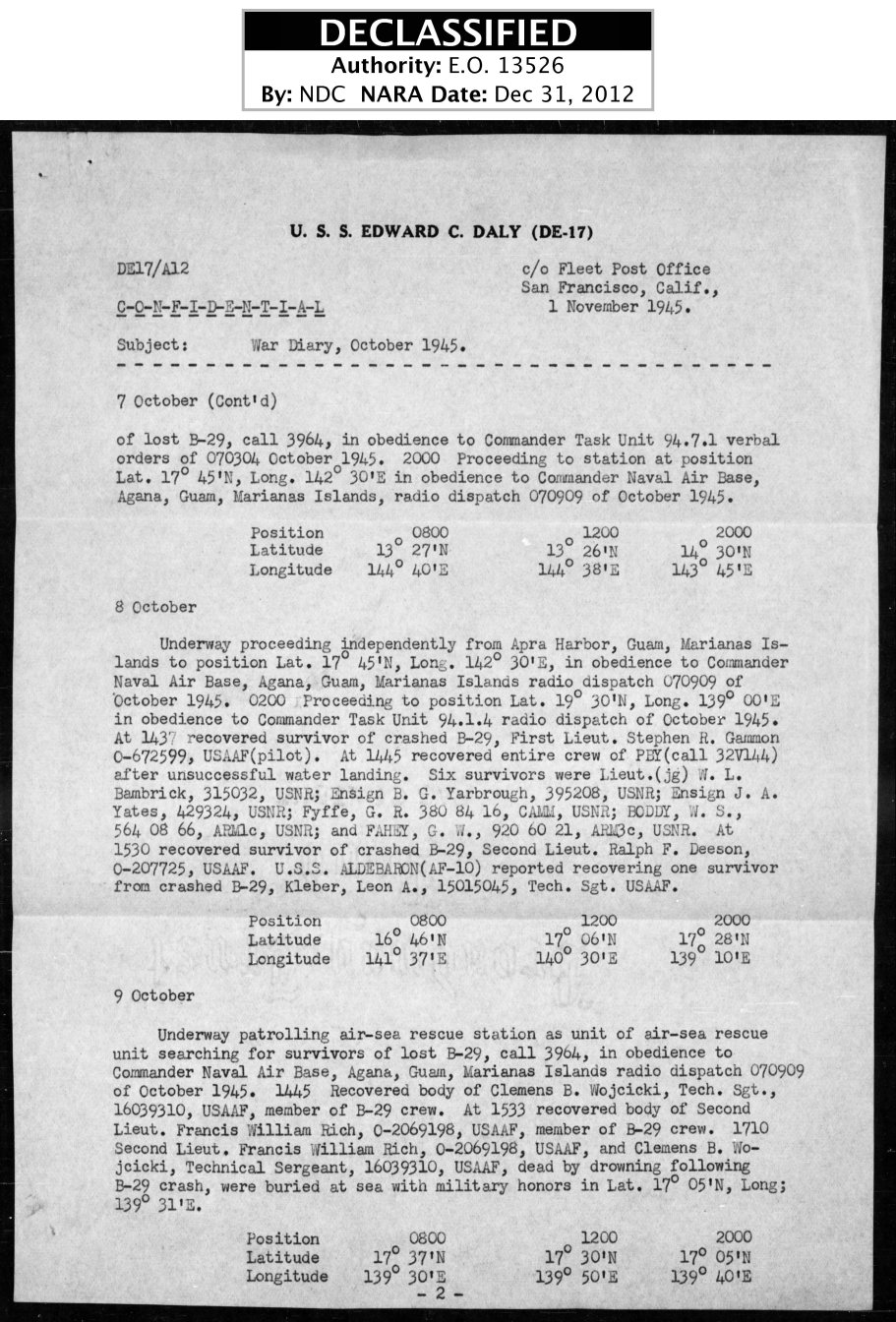 Log Sheet 08/09 October 1945 ![]() Courtesy of Thomas Deits |