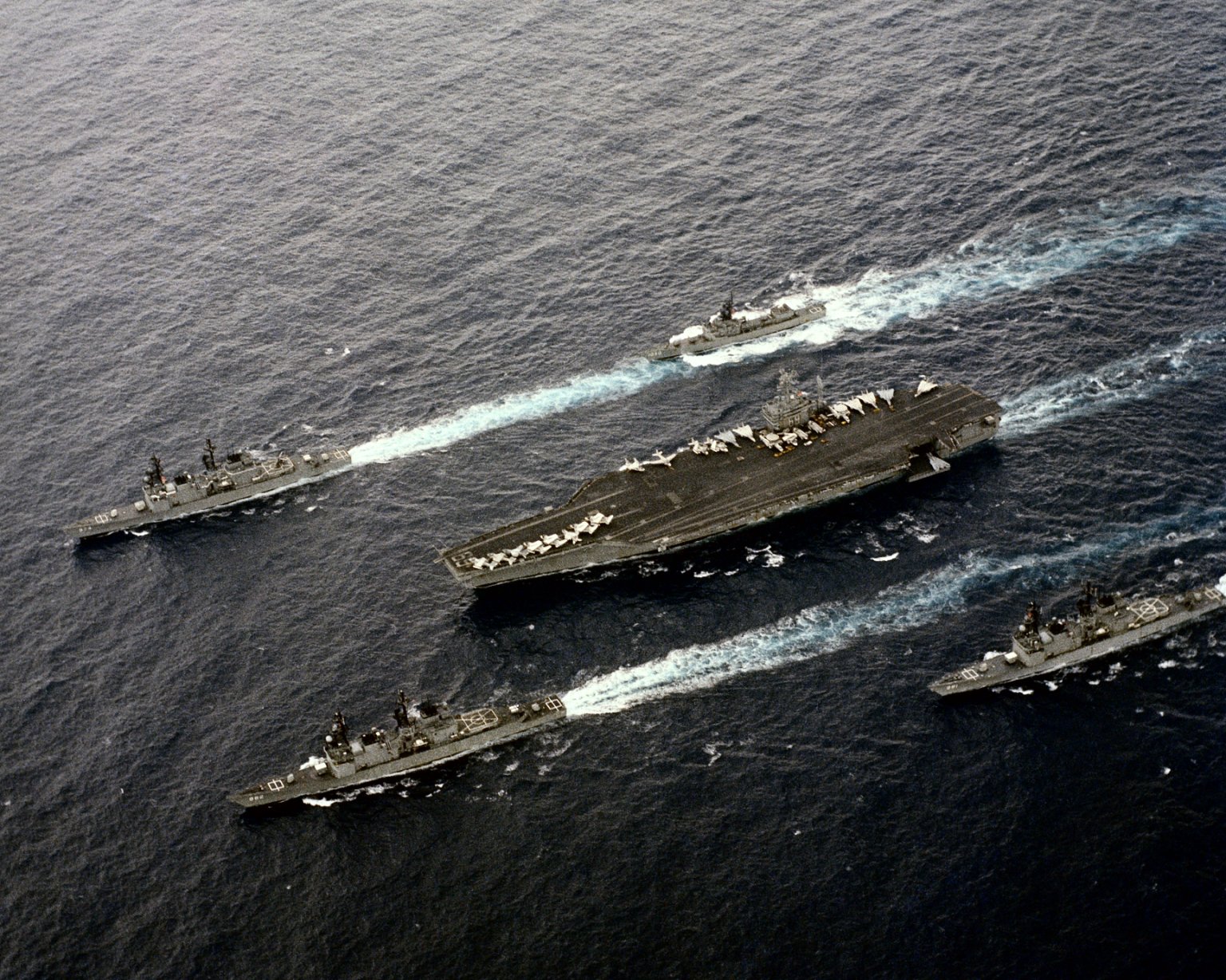 Dwight D. Eisenhower (CVN 69), underway. Ike's escorts are, clockwise from upper left, the destroyer USS