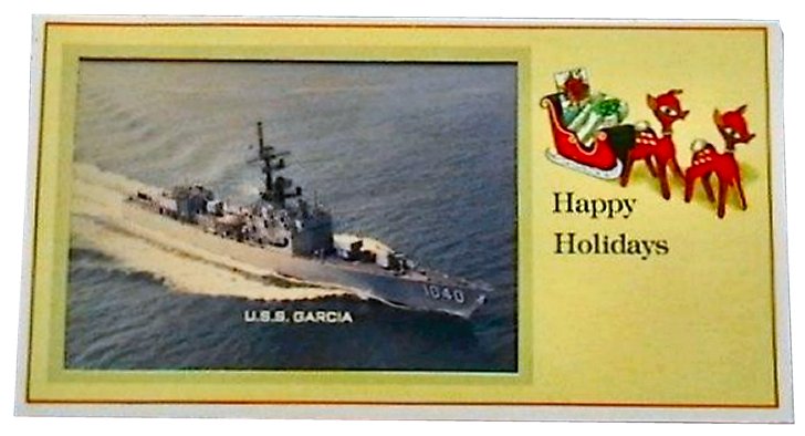 Atlantic Fleet Sales, Norfolk, Va.; shown at 150% of original size) Caption reads: U.S.S. Garcia (FF-1040) - The first of the "Garcia" class frigates of the United States Navy. Built by Bethlehem Steel Corporation, San Francisco, Calif., and commissioned on 21 December 1964. | ||