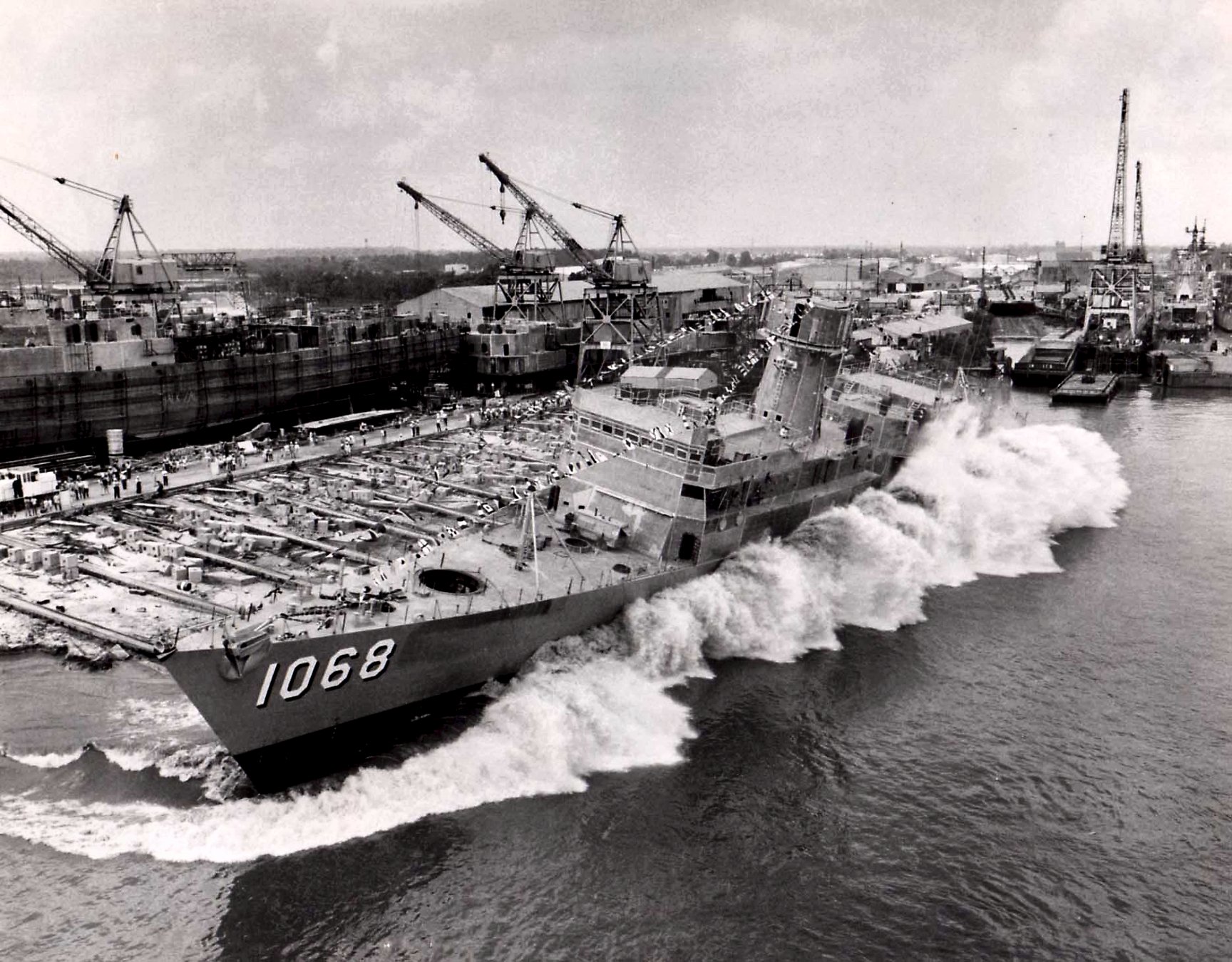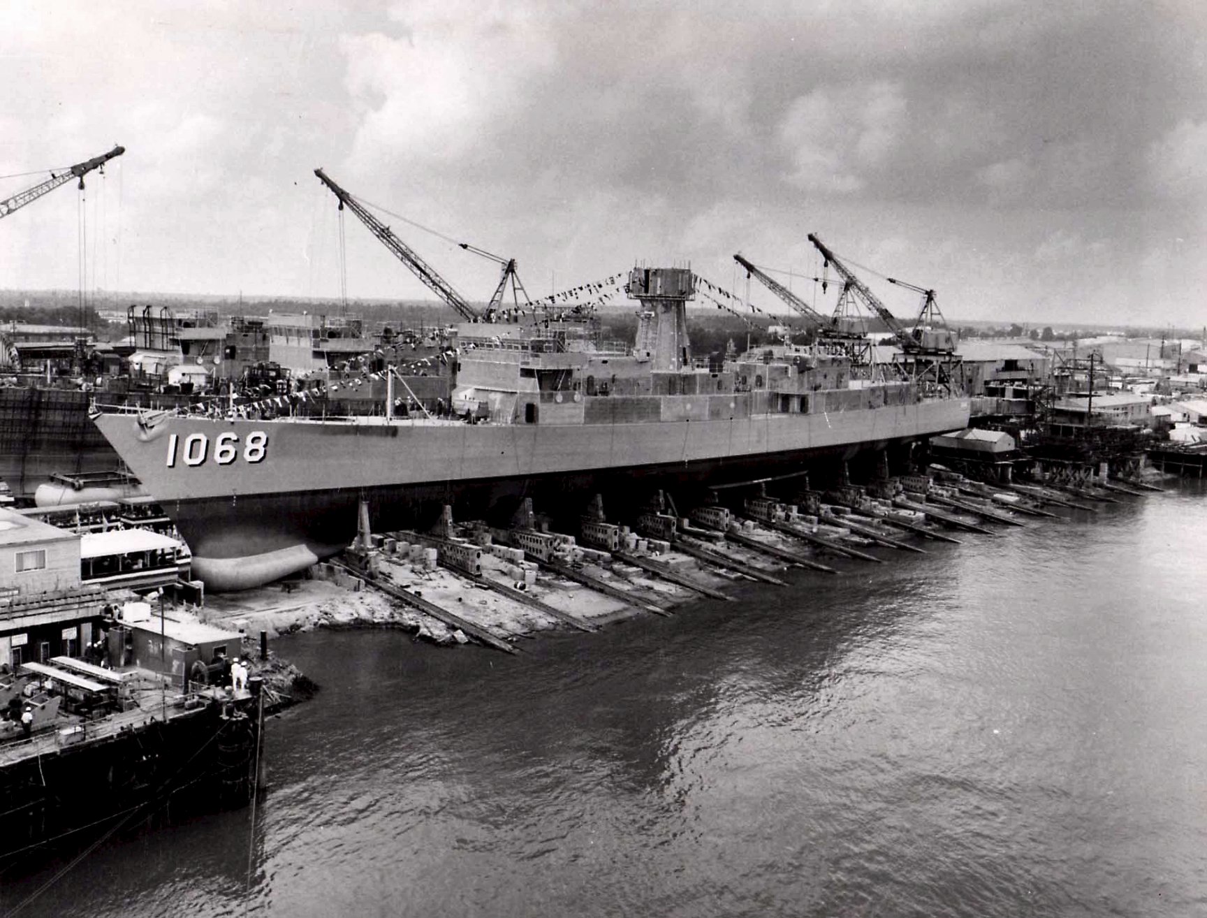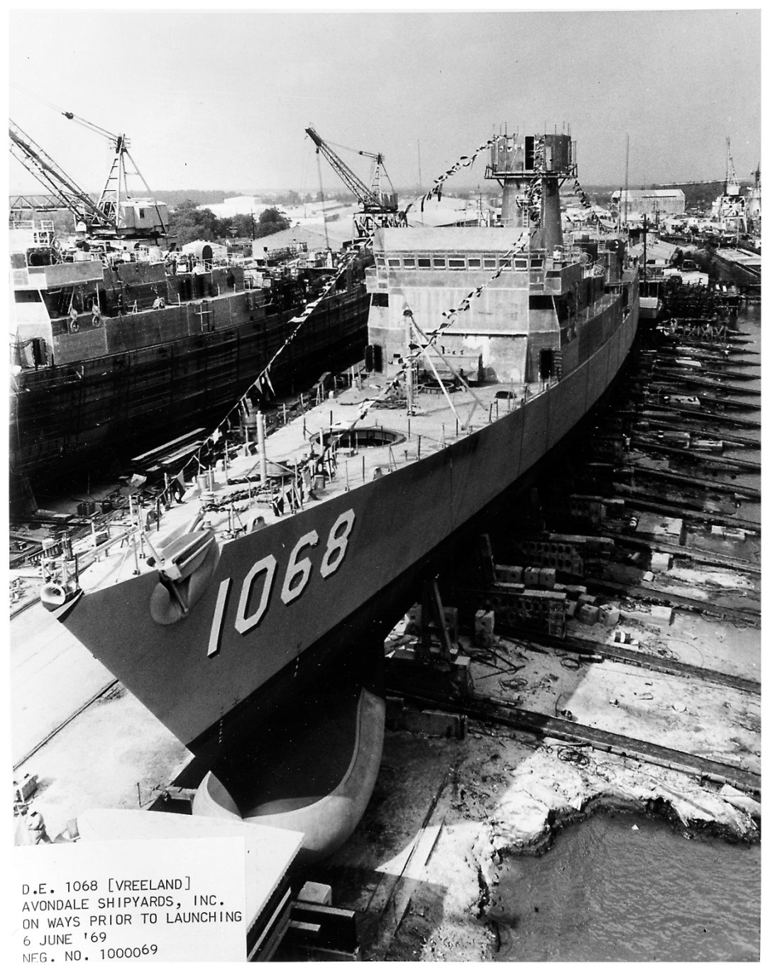 316k | 06 June 1969: Westwego, La. - The future USS Vreeland (DE 1068) is gaily decorated for the launching ceremony at Avondale Shipyards, Inc. (U.S. Navy National Archives photo #USN 1140972 from the Naval History and Heritage Command) |