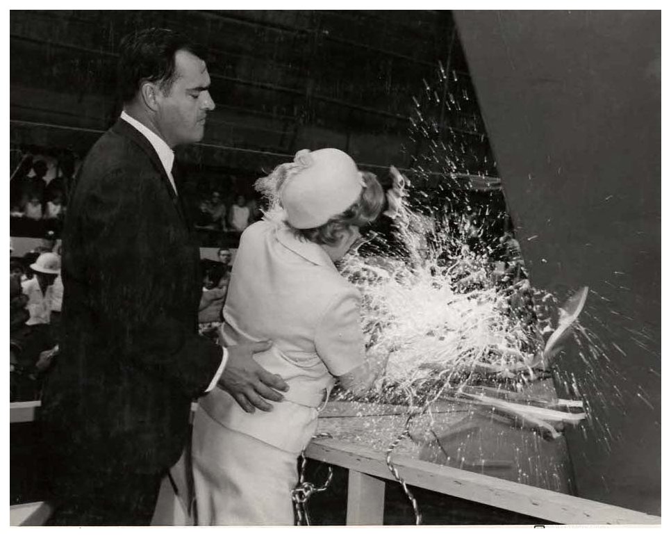 112k | 16 June 1969: Westwego, La. - Mrs. Rebecca (Thompson) Whitten breaks the traditional bottle of champaign over the bow of the future USS Vreeland (DE 1068), commencing the launch process for the new destroyer escort. | S. Dale Hargrave Newport News, Va. | |