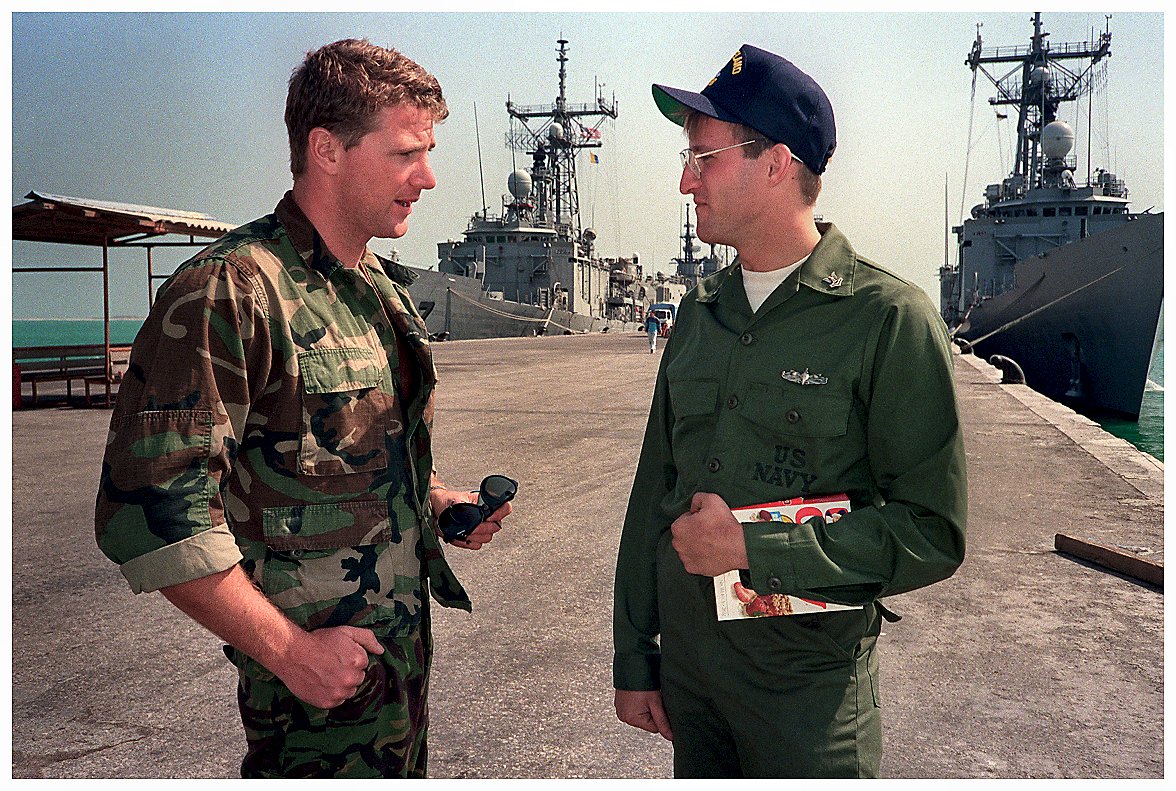 Specialist 2nd Class (SW) John Lewis from the frigate USS Vreeland (FF-1068) during a port call, their first since the beginning of Operation Desert Storm. (U.S. Navy photo DVID #DN-SC-91-05309 by CWO2 Ed Bailey from the DVIC) | ||