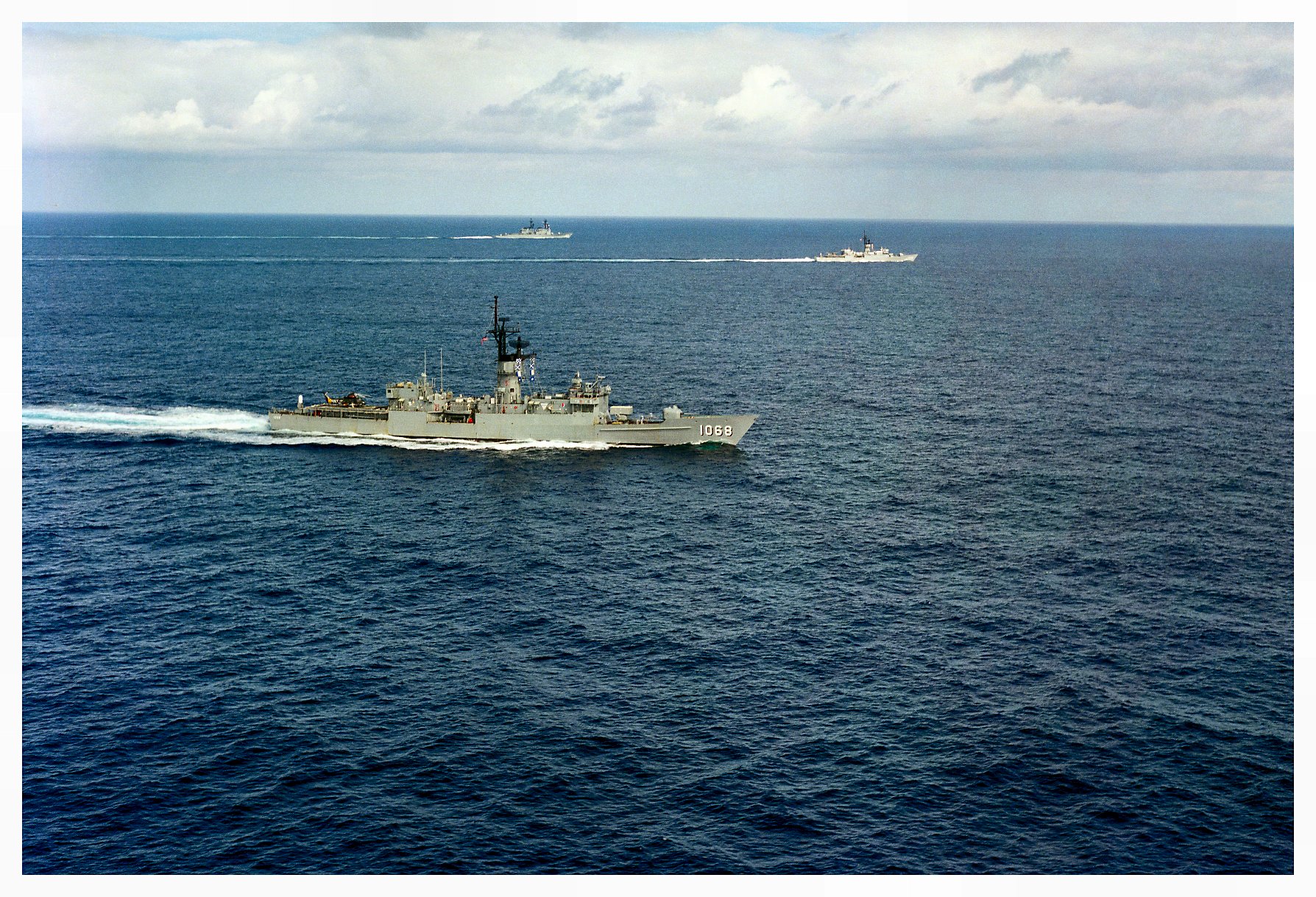 171k | 01 March 1988: at sea - A starboard beam view of the frigates USS Vreeland (FF 1068) and USS