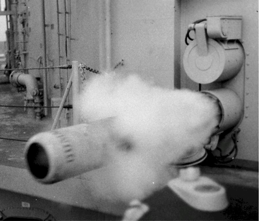 142k | November 1972: the Caribbean Sea - Mount 51 ejecting a spent shell casing after firing a round, taken off Culebra Island, PR. | ||
