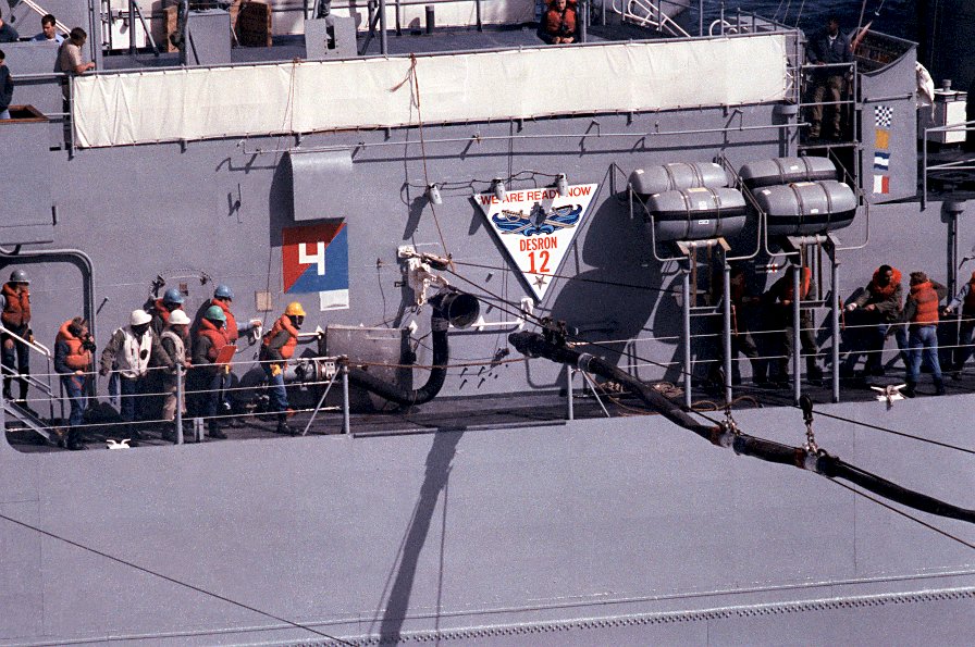 185k | 05 September 1988: At sea - Fuel lines trail in the water as they are passed from Forrestal to Elmer Montgomery. (U.S. Navy photo DVID #DN-SN-90-03008 by PH3 Camerer from the DVIC) | ||