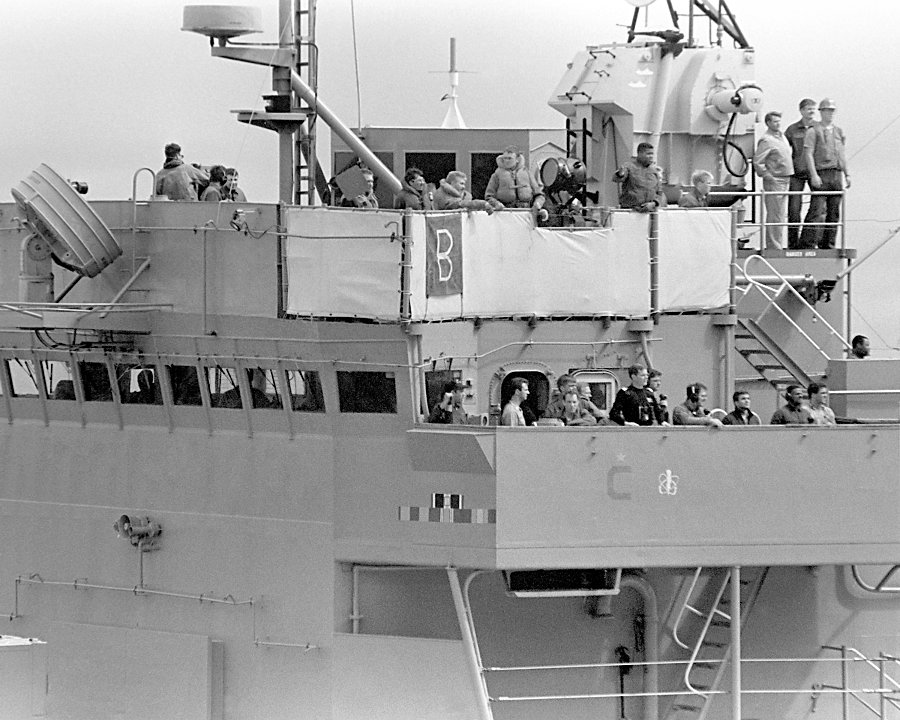 92k | 28 March 1991: Naval Station Mayport - Crew members aboard Elmer Montgomery look out from the railing upon the vessel's return to port along with four other ships of