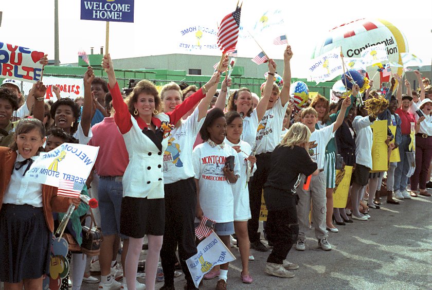 125k | 28 March 1991: Naval Station Mayport - Two girls wave flags as they stand in the crowd gathered to welcome Elmer Montgomery returning to Mayport after serving in