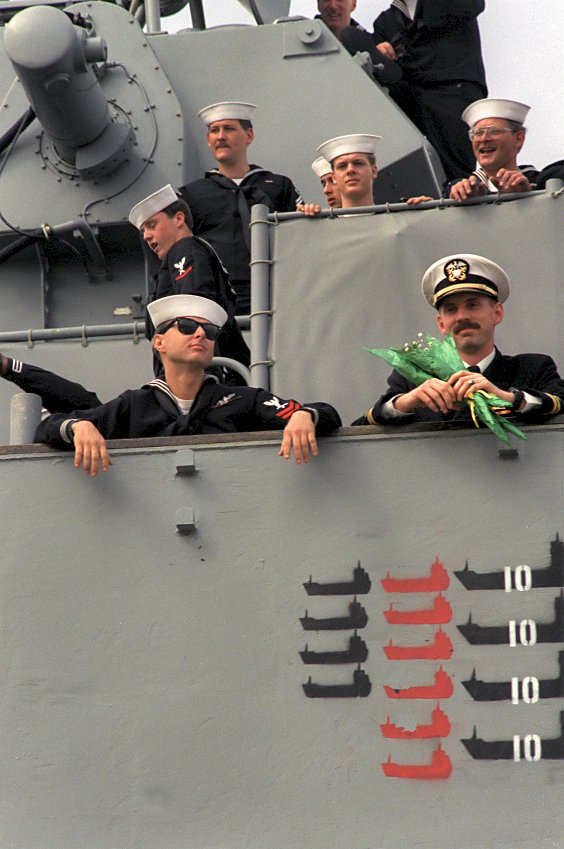 117k | 28 March 1991: Naval Station Mayport - Crew members aboard Elmer Montgomery look out from the railing upon the vessel's return to port. (U.S. Navy photo DVID #DN-SC-91-07724 by PH3 Lorrie Hughes-Smith from the DVIC) | ||
