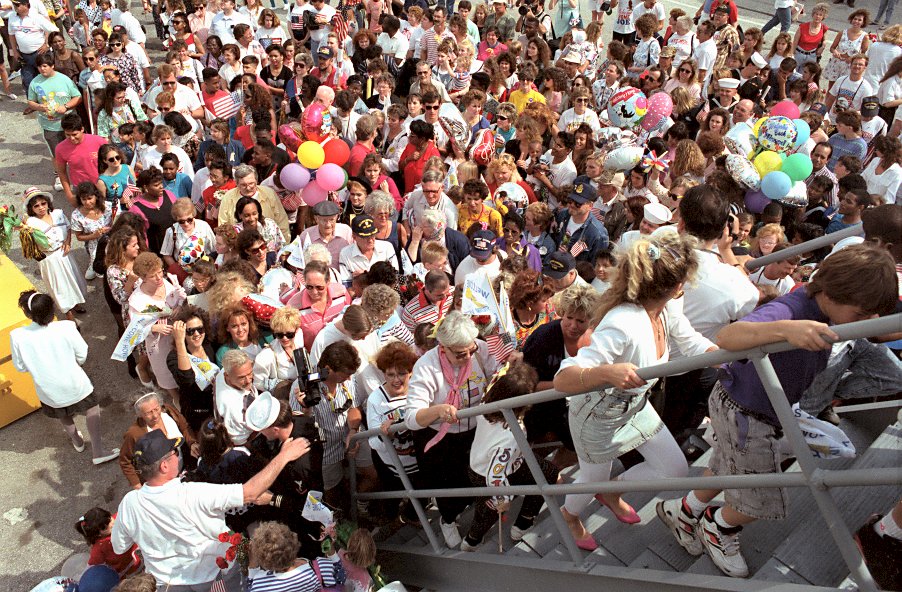 218k | 28 March 1991: Naval Station Mayport - Family members and friends crowd onto the accommodation ladder to go aboard Elmer Montgomery. (U.S. Navy photo DVID #DN-SC-91-06941 by Julie Irwin from the DVIC) | ||
