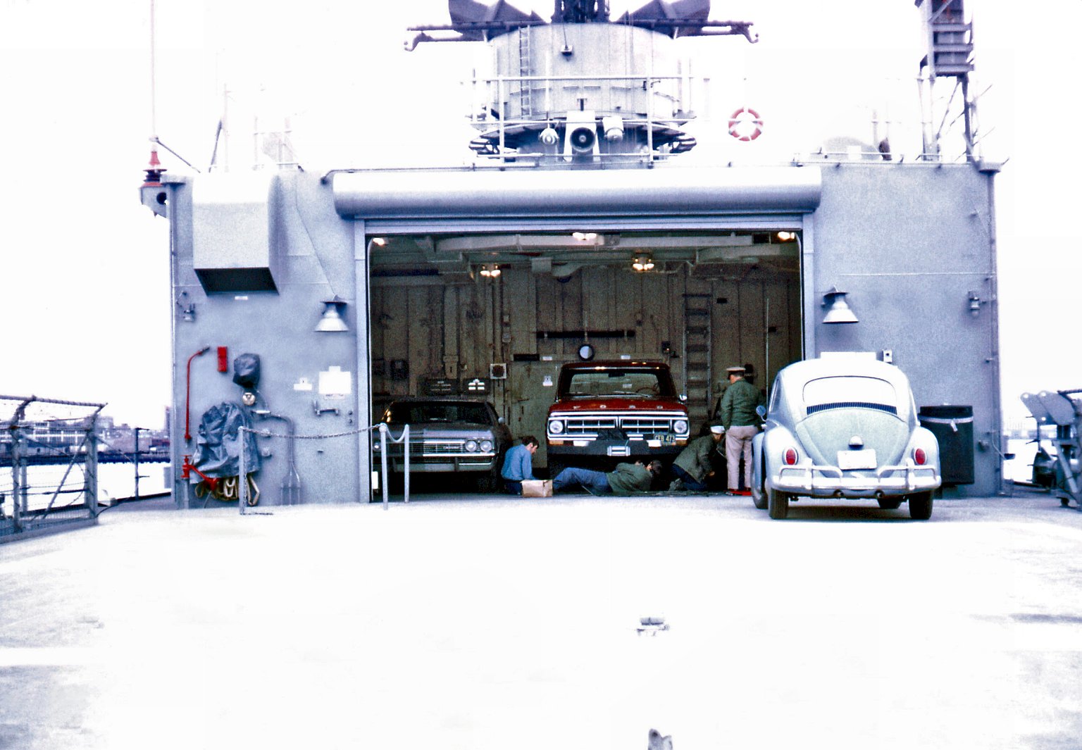 218k | 16 January 1972: Boston, Mass. - Vehicles being secured to the deck of Montgomery's DASH hanger prior to the ship moving from the Boston Naval Shipyard. Four vehicles were loaded aboard for the ship's movement from Boston to Norfolk, at the completion of the new construction fitting out availability. | ||