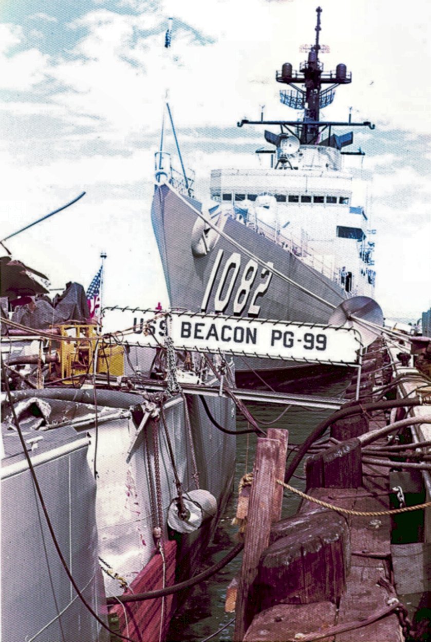 217k | 10 March 1972: Guantanamo Bay, Cuba - The patrol gunboat USS Beacon (PG 99) after collision with a Dutch gunboat, dockside in Guantanamo Bay. The frigate USS Elmer Montgomery (DE 1082) is visible in the background. | Bob Hurst Worksop, Nottinghamshire, England, United Kingdom | |