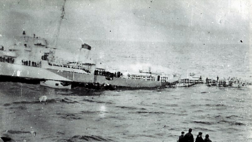 22 August 1944: HMS Bickerton (ex-USS Eisele DE 75), down by the stern after being torpedoed by a U-boat during Operation "Goodwood". She was later sunk by friendly forces in order not to make increased difficulties for the surviving escorts, who were already having to cover the stricken escort carrier HMS Nabob. (Photo from the author's collection as printed in "The Captain Class Frigates in the Second World War" by Donald Collingwood) |
