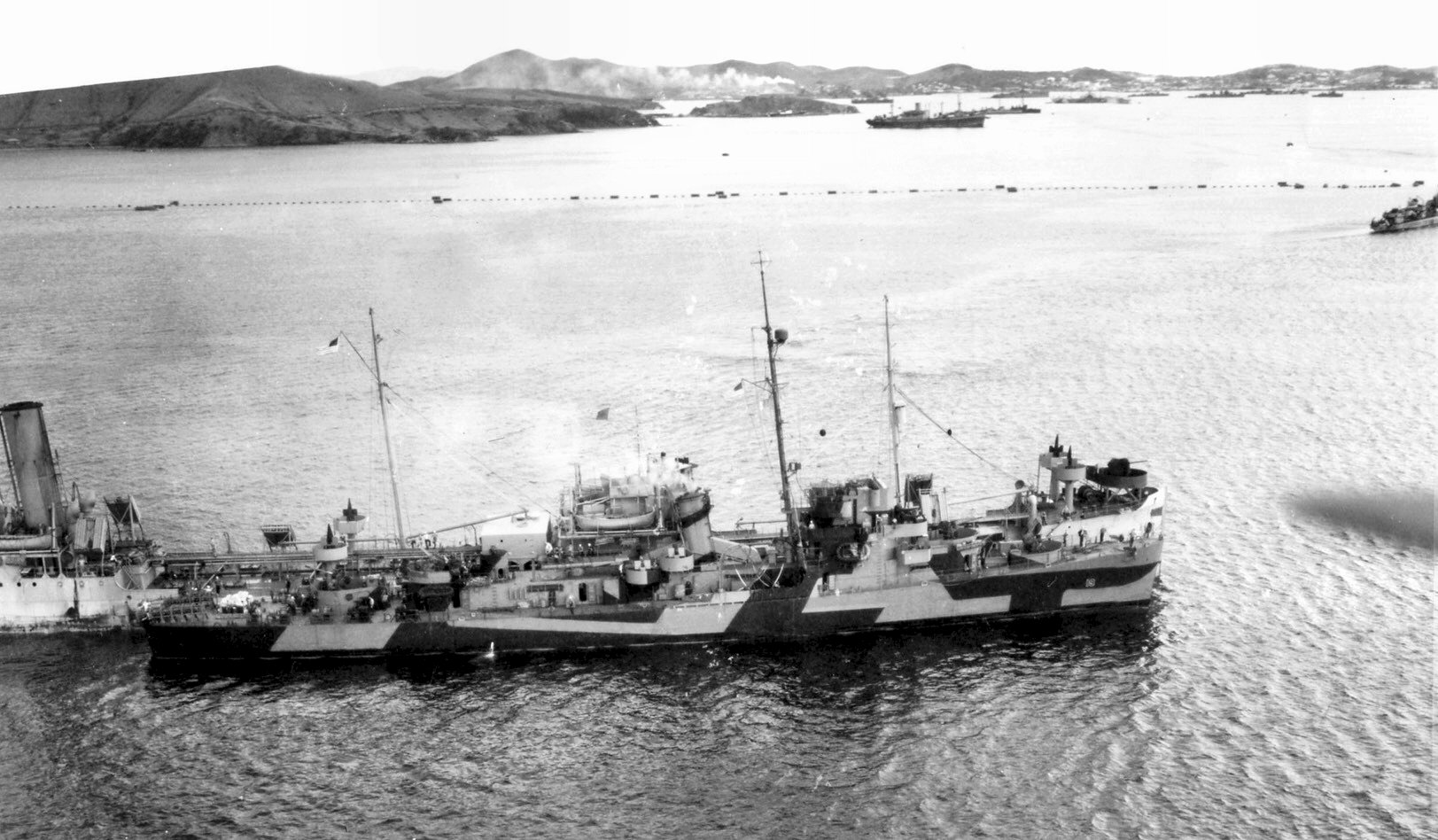 net enclosing the inner harbor is visible in the background. (U.S. Navy photo #19-LCM-DE198-4 from the National Archives and Records Administration, College Park, Md., courtesy of C. Lee Johnson, Ships of the U.S. Navy in WWII “Dazzle” Camouflage) |