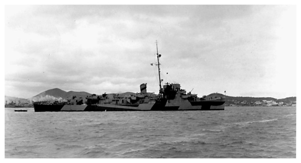 place of the SA radar at the masthead. Photo by U.S. Navy SeaBee Detachment 1019. (U.S. Navy photo #19-LCM-DE198-1 from the National Archives and Records Administration, College Park, Md., courtesy of C. Lee Johnson, Ships of the U.S. Navy in WWII “Dazzle” Camouflage) |