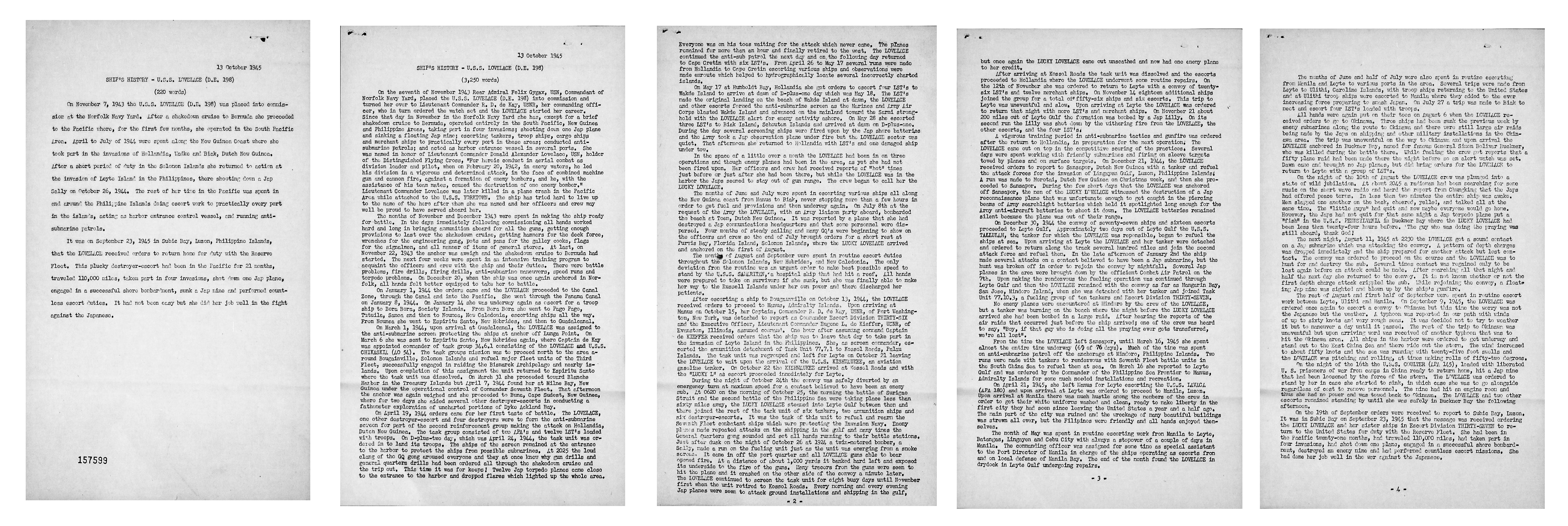 | View the official War History of USS Lovelace as submitted by the ship at war's end. |