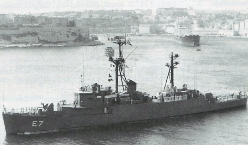 forward. She also has an enclosed bridge and long amidships deckhouse. (U.S. Navy Photo; from "The World Encyclopedia of Destroyers and Frigates" by Bernard Ireland) |