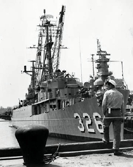 50k | 02 August 1957: Philadelphia, Pa. - Starboard bow view of the newly recommissioned USS Thomas J. Gary (DER 326) moored at Pier 6 at the Philadelphia Navy Yard. The