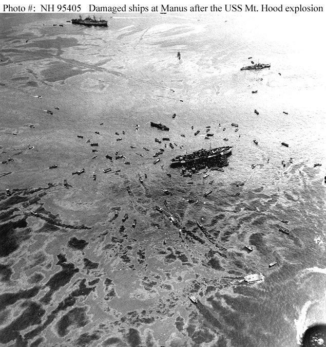 10 November 1944: Seeadler Harbor, Manus, Admiralty Islands - Just after the explosion of USS Mount Hood (AE 11). Small craft gathered