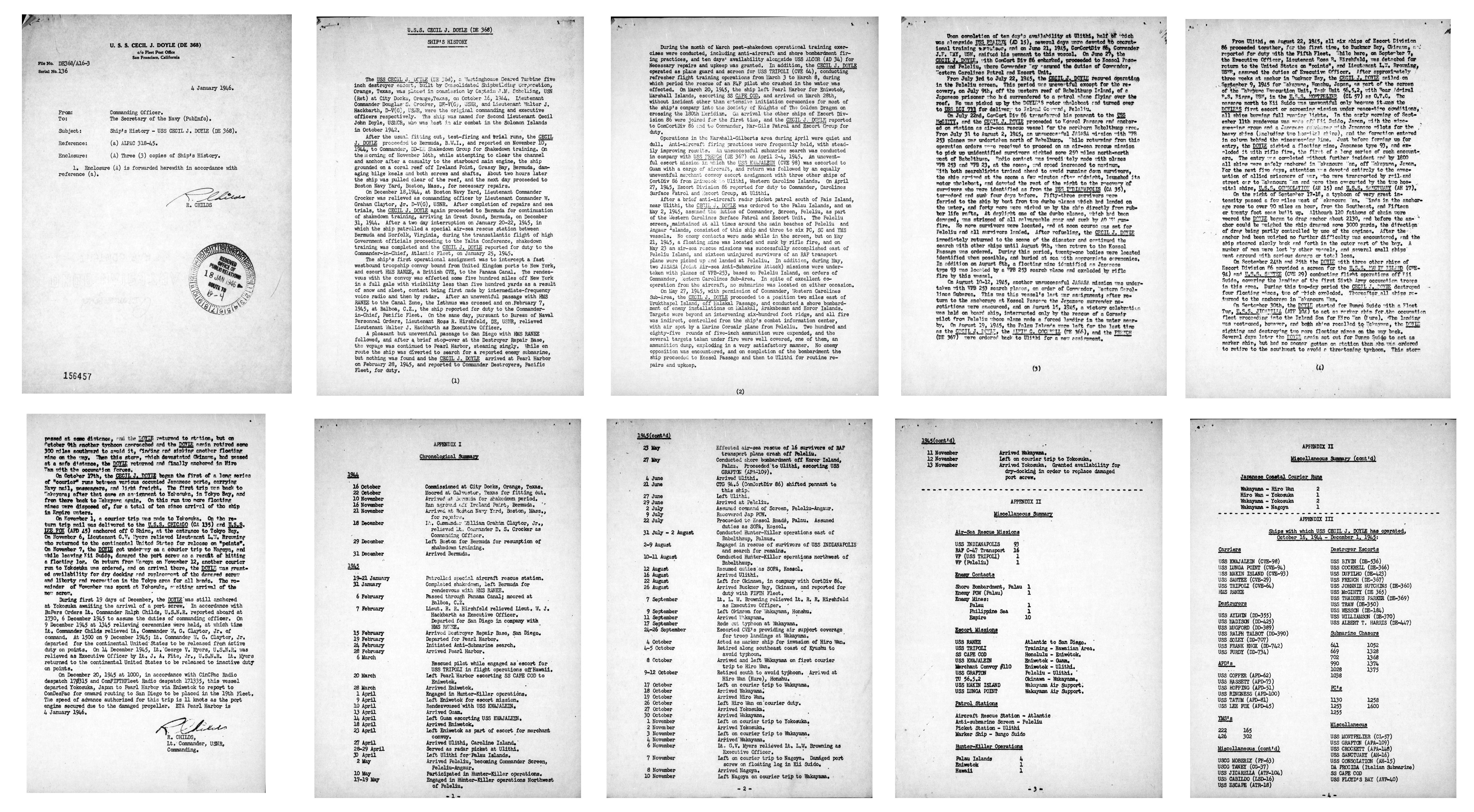 | View the official War History of USS Cecil J. Doyle as submitted by the ship at war's end. |