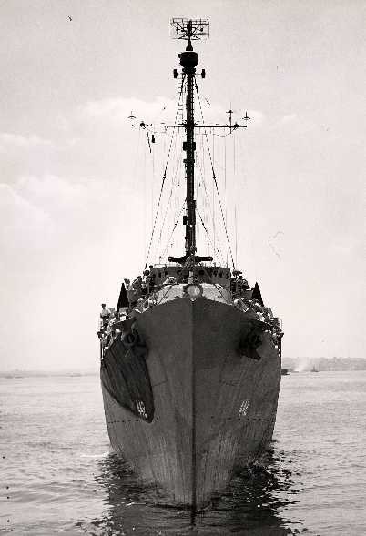 40mm Bofors has radar control, and depth charge throwers have been moved forward to give a clear field of fire to the after 5"/38 mounting. This ship has been awarded the Efficiency "E"