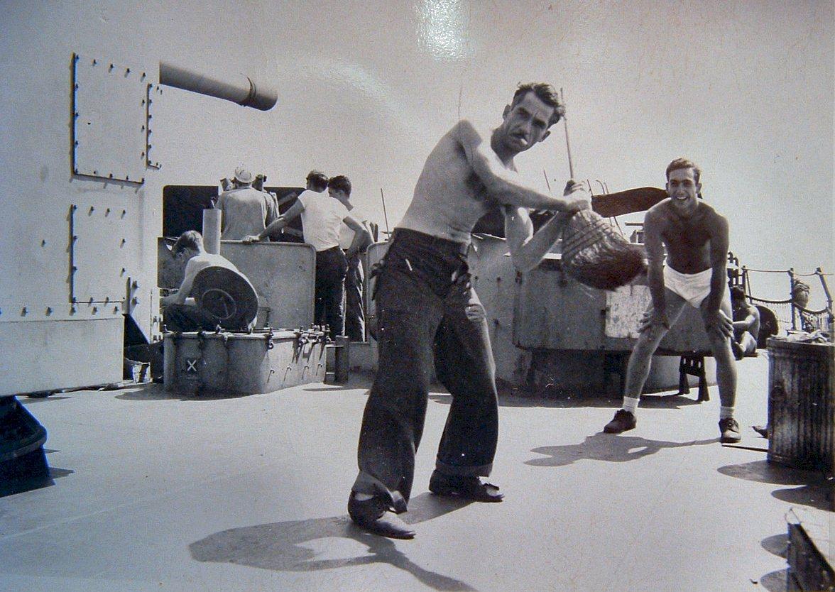 194k | Frank Esposito and Frank Pulicare in a game of stickball on the fantail | ||