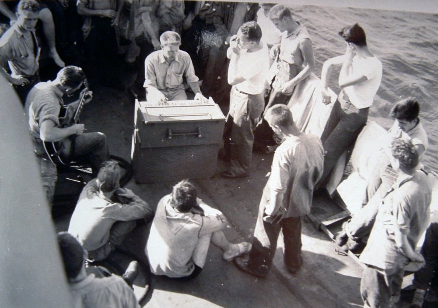 105k | Entertainment was simple for self-starters, and always got a great reception. Lt. Bill Bell at the organ, and Lt. Hugo Francis on the harmonica. | ||