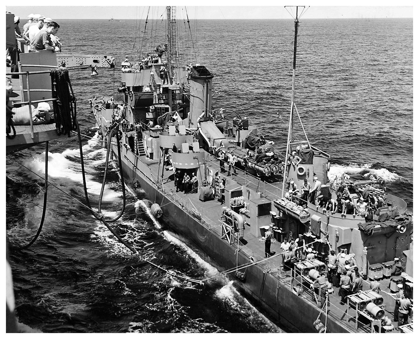 10 May 1944: the Atlantic Ocean - Ranger's sailors look on as Robert I. Paine completes a two-hour refueling and begins preparations to pull