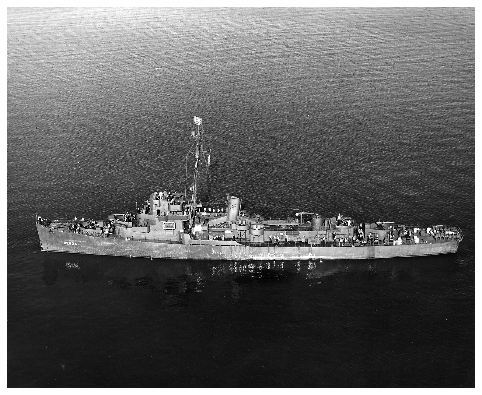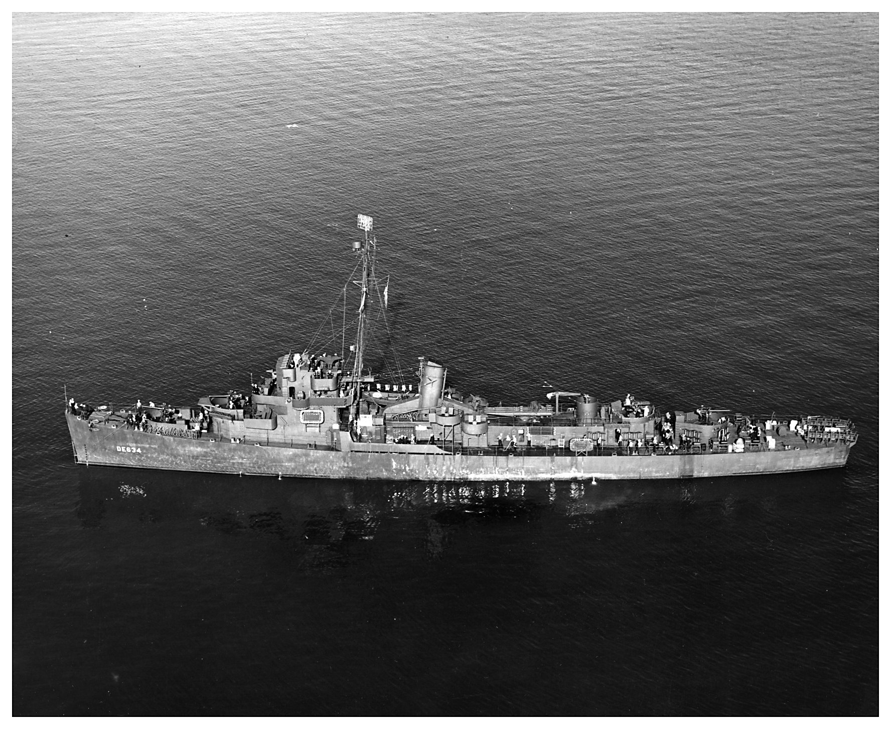 515k | 30 November 1943: Port broadside aerial view of destroyer escort USS Whitehurst (DE 634) in San Francisco Bay. (U.S. Navy National Archives photo #USN 200669 from the Naval History and Heritage Command) |