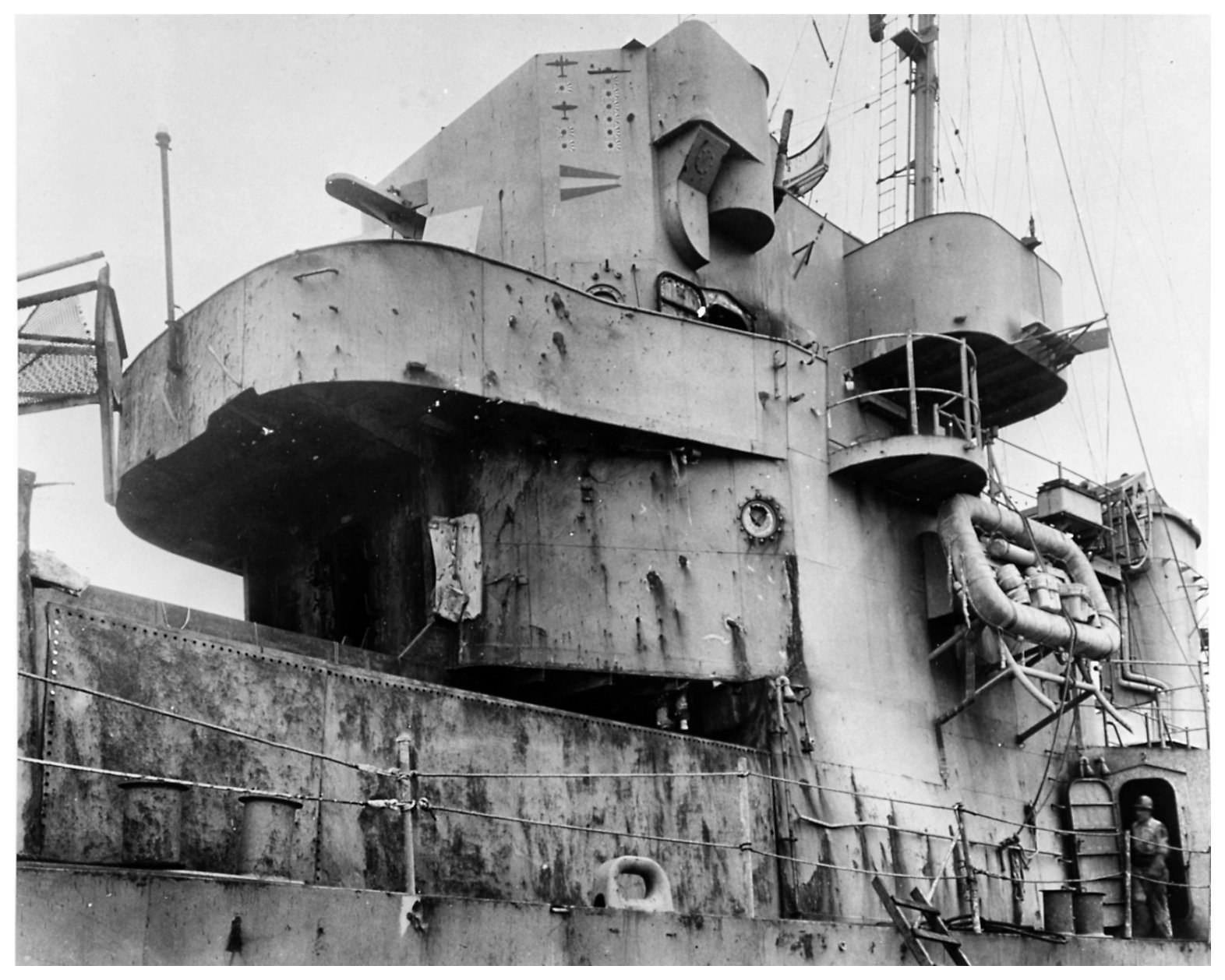 forward superstructure, near where the suicide plane struck. Note scoreboard painted on the bridge face, showing her Presidential Unit Citation pennant and symbols for the six Japanese